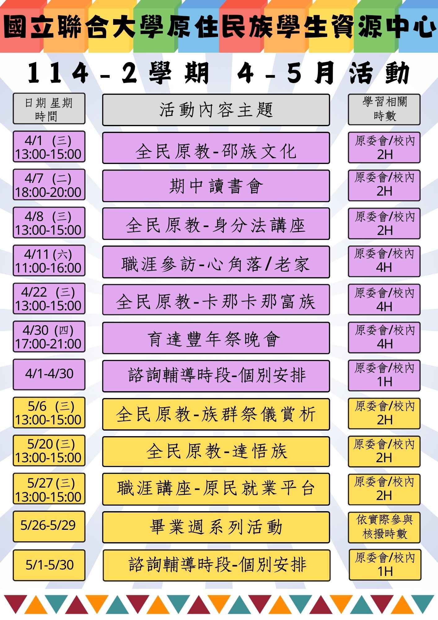 原資中心於114-2學期將舉辦多元活動,本學期重點為職涯發展,歡迎大家課業之餘踴躍參加,增進情感、互相交流、尋找未來方向及傳承與瞭解原住民族相關之文化意涵。